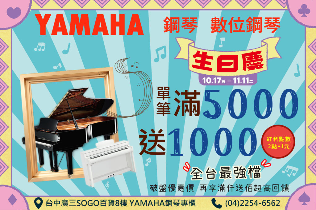 【全台最強檔 買琴最優惠】驚喜破盤價!再享滿仟送佰超高回饋 YAMAHA鋼琴專櫃 生日慶 10/17-11/11 只在 台中廣三SOGO 8F