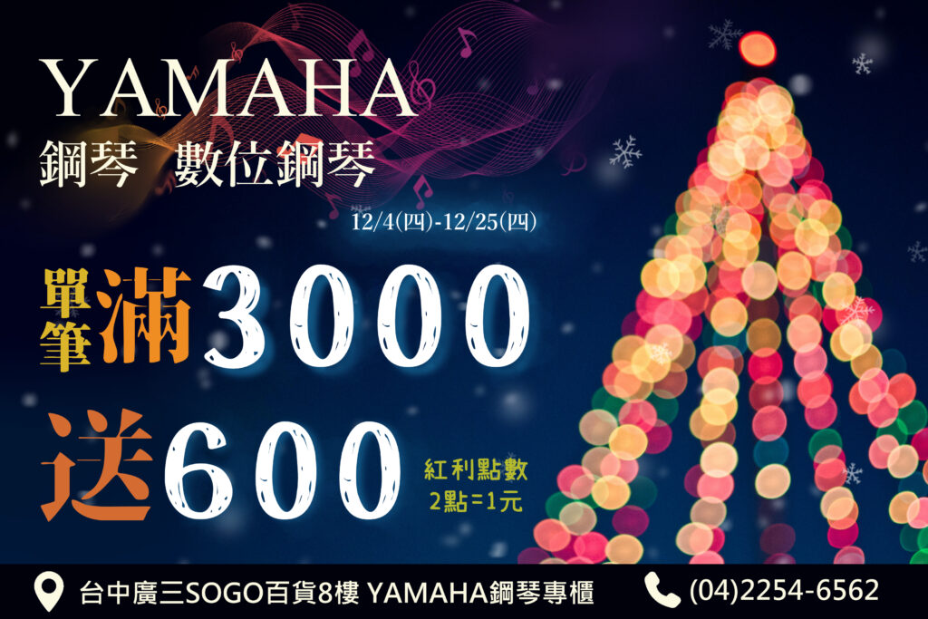 【全台最強檔 買琴最優惠】驚喜破盤價!再享滿仟送佰超高回饋 YAMAHA鋼琴專櫃 聖誕強檔12/4-12/25 只在 台中廣三SOGO 8F