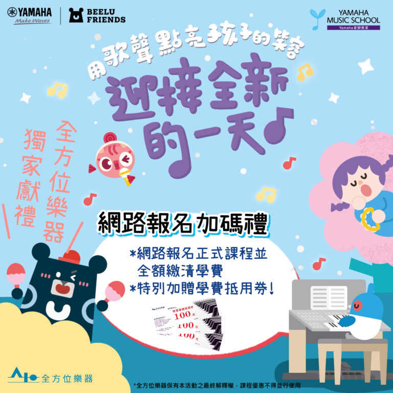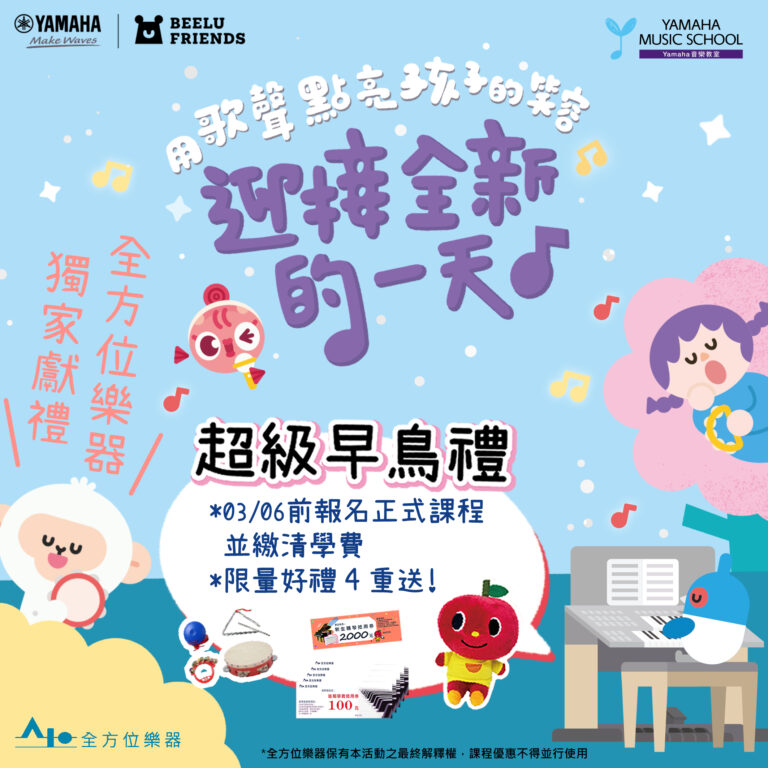 凡新生報名春季團體班課程,並繳清學費(三個月)者,即可獲得「噗噗嚕可愛玩偶(限量品)+節奏樂器包(價值 600 元)+後期學費抵用券500元+新生購琴抵用券2000元」。