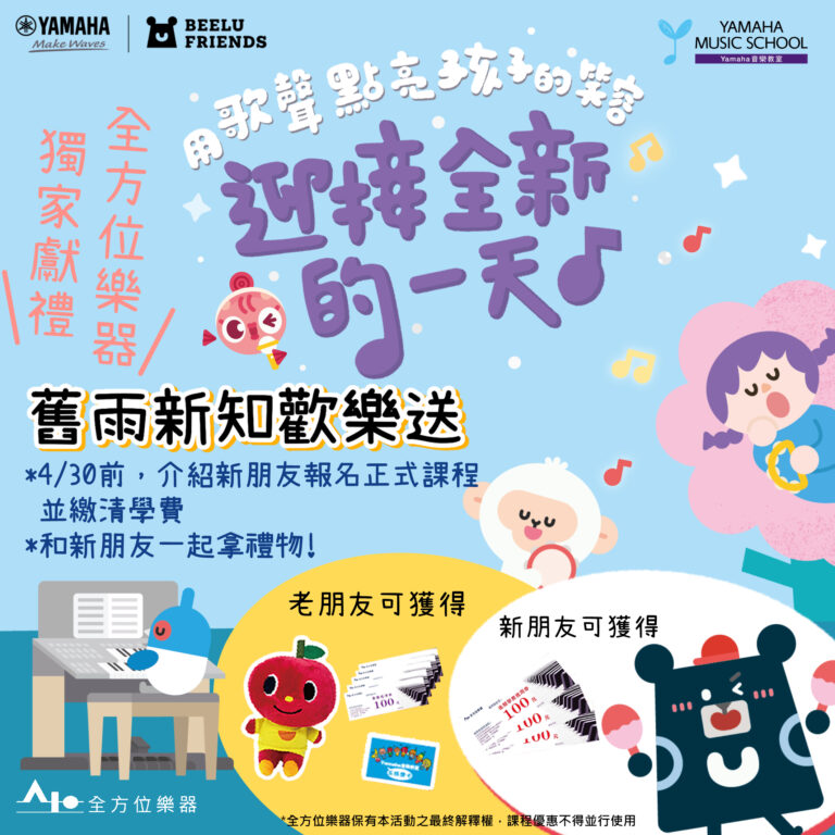 無論您是YAMAHA目前舊生或本季新生,只要您填妥介紹券介紹新朋友報名YAMAHA團體班,新朋友繳清學費(三個月),老朋友即可獲得「噗噗可愛玩偶(限量品)+學費抵用券500元+五張獎卡」,此外新朋友也可獲得「後期學費抵用券300元」。